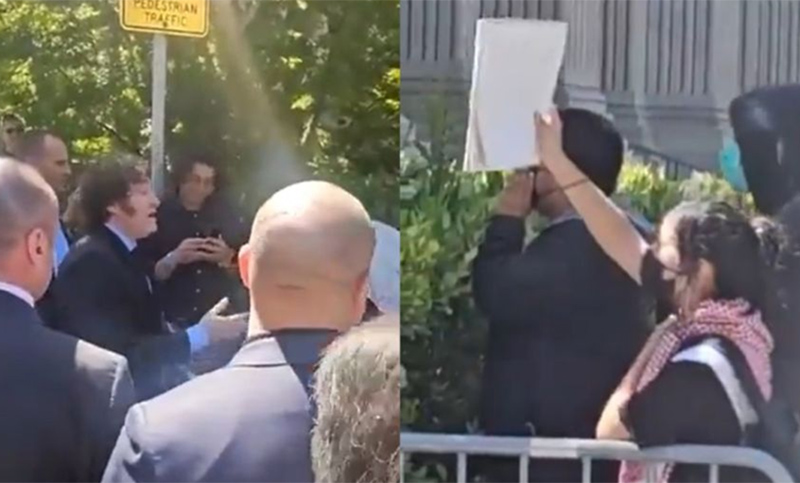 «Milei, fascista. No queremos tu visita», coreaba el grupo, rechazando la llegada del mandatario argentino a California, donde cumple con una agenda de reuniones privadas. Lejos de evitar el enfrentamiento, el jefe de Estado decidió acercarse al grupo de tres jóvenes para conversar con ellos. Sin embargo, los manifestantes continuaron expresando su repudio con carteles en contra de Milei.