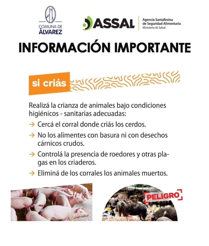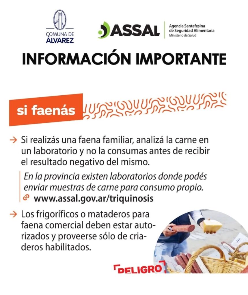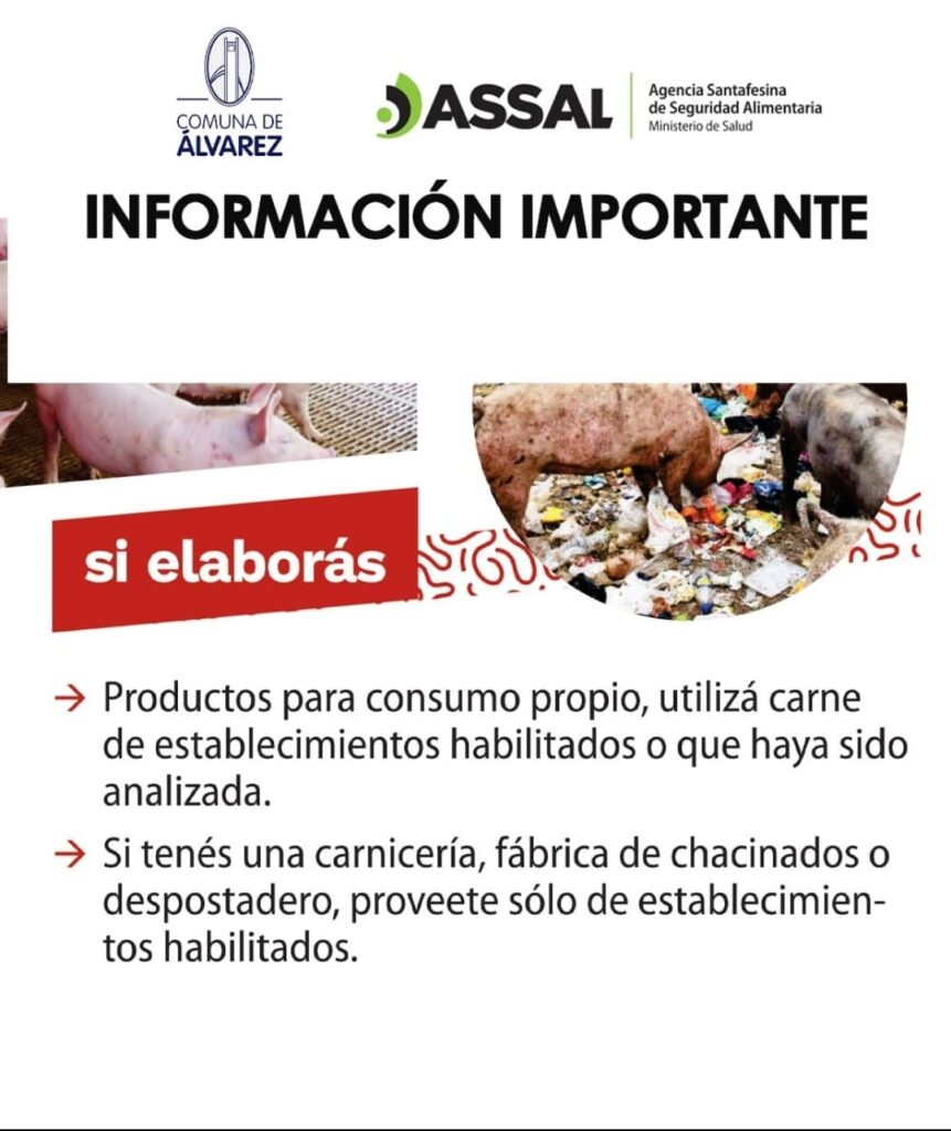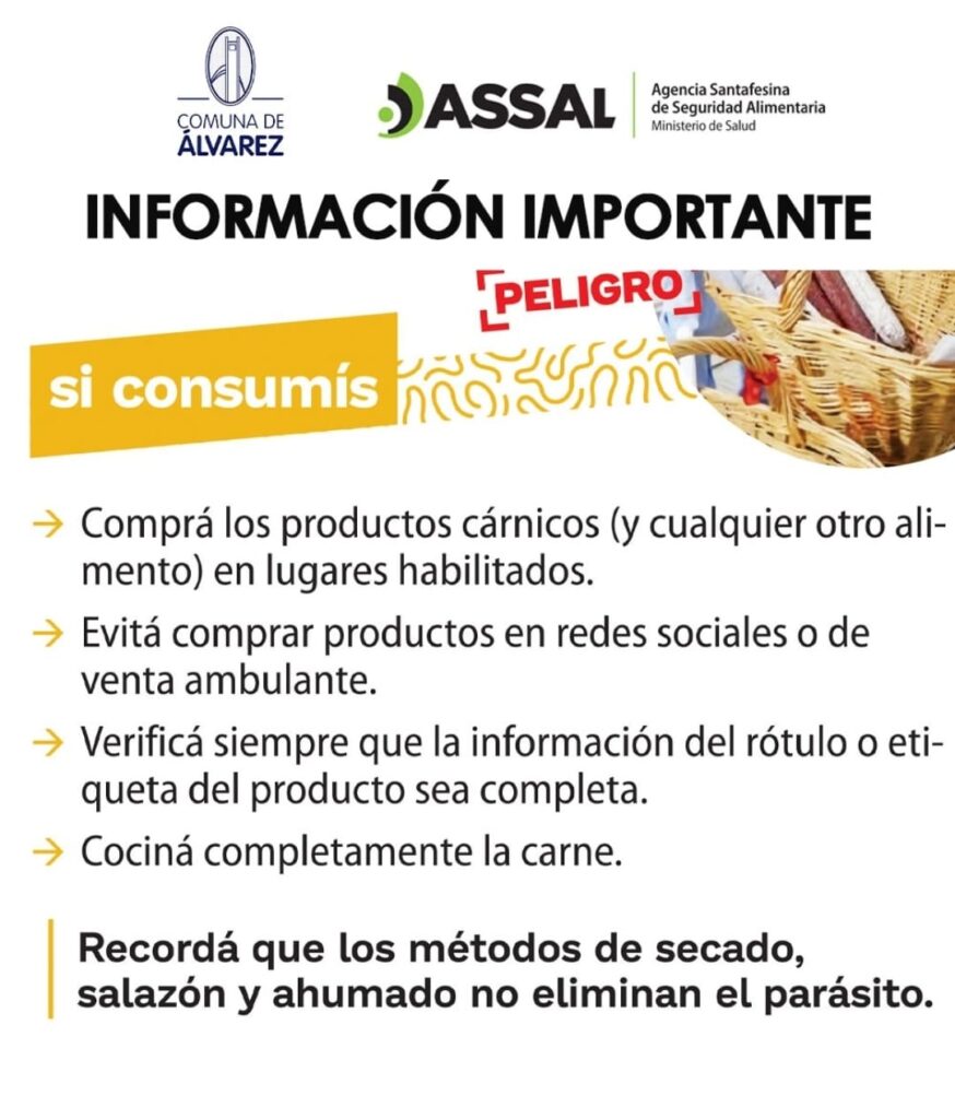 ASSAL Álvarez informa que debido a los brotes de triquinosis detectados en Acebal y Funes, solicitan a todos los alvarenses a tomar medidas preventivas a la hora de elaborar o consumir alimentos elaborados con carne de cerdo.