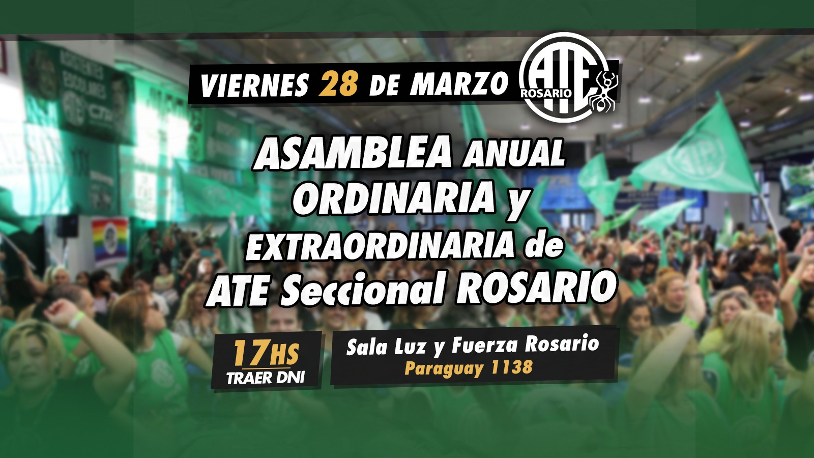 El día viernes 28 de marzo, desde las 17:00 horas, en Paraguay 1138 de Rosario, la Seccional de ATE realizará su Asamblea Anual Ordinaria y Extraordinaria. Los afiliados pueden participar presentando su DNI.