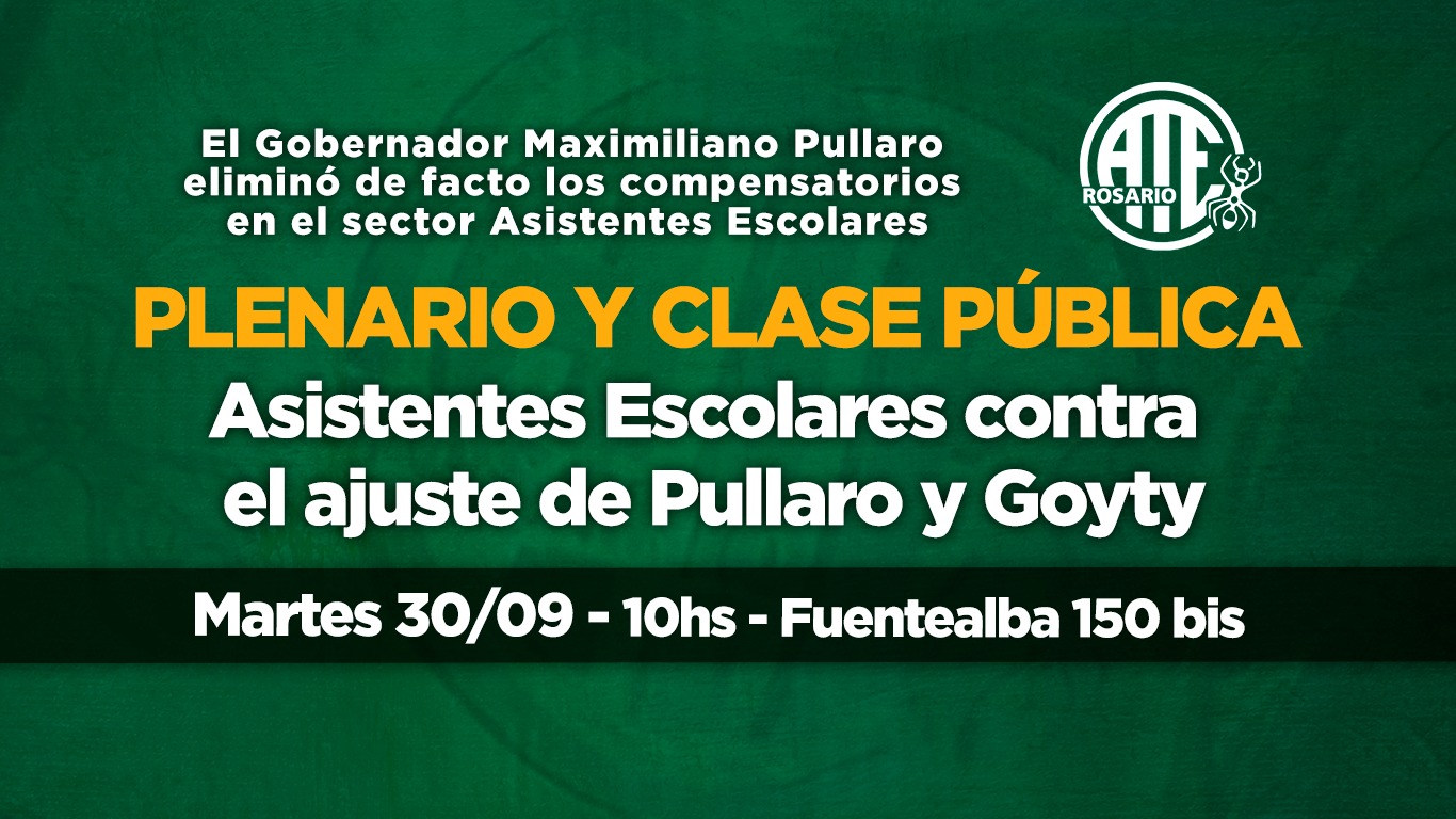 El Gobernador Maximiliano Pullaro eliminó de facto los compensatorios en el sector Asistentes Escolares. Es el área con peores salarios, más numerosa y feminizada de la administración pública provincial a la que viene castigando sin tregua. Habrá concentración el martes 30 a las 10.00, con plenario y clase pública en la Regional VI Ministerio de Educación (Fuentealba 150 bis).