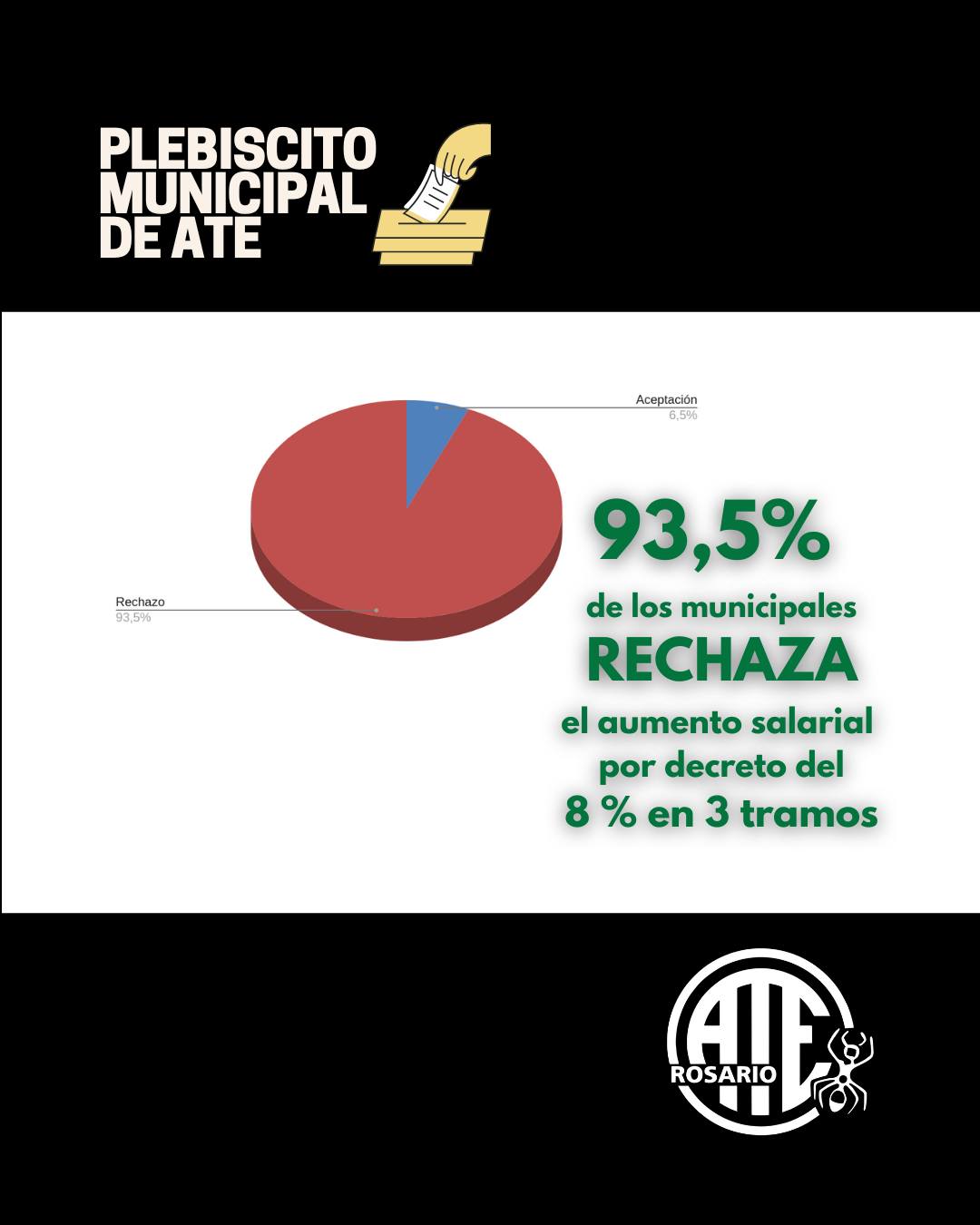 Tras la consulta realizada a las y los trabajadores del sector, el 93,5% de los municipales, rechazó la propuesta salarial del ejecutivo – por decreto – del 8 % en 3 tramos-.