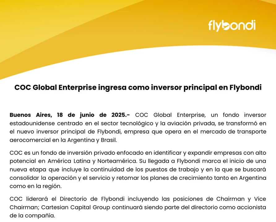 COC Global liderará el Directorio de Flybondi, asumiendo las posiciones de Chairman y Vice Chairman. En tanto, el fondo Cartesian Capital Group, hasta ahora principal accionista, continuará participando en el Directorio como socio de largo plazo.
