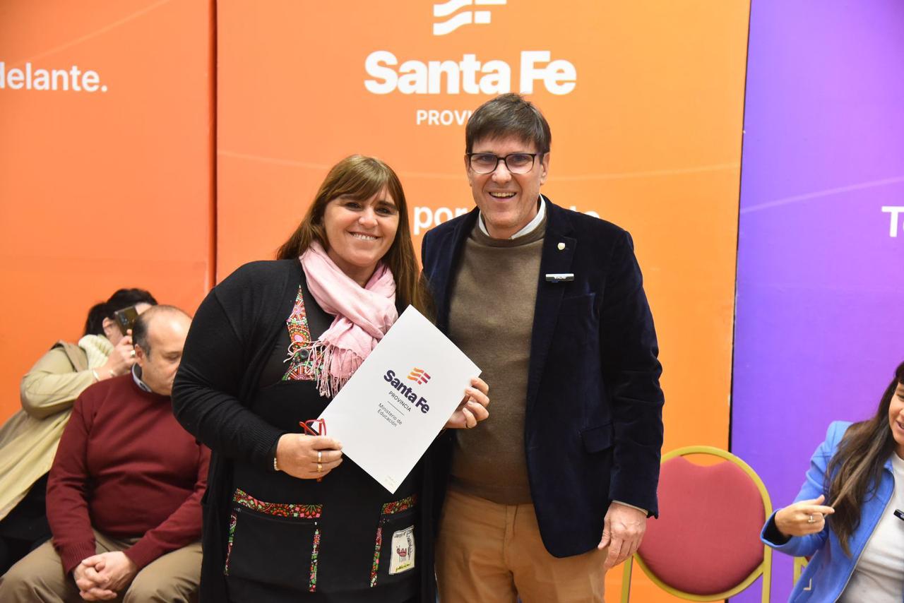 El acto se desarrolló en la Sala Walsh de la sede de Gobierno en Rosario y fue encabezado por el ministro de Educación, José Goity, junto a la secretaria General, María Martín, y la secretaria de Gestión Territorial Educativa, Daiana Gallo Ambrosis. También participaron equipos directivos y docentes de las instituciones beneficiadas.