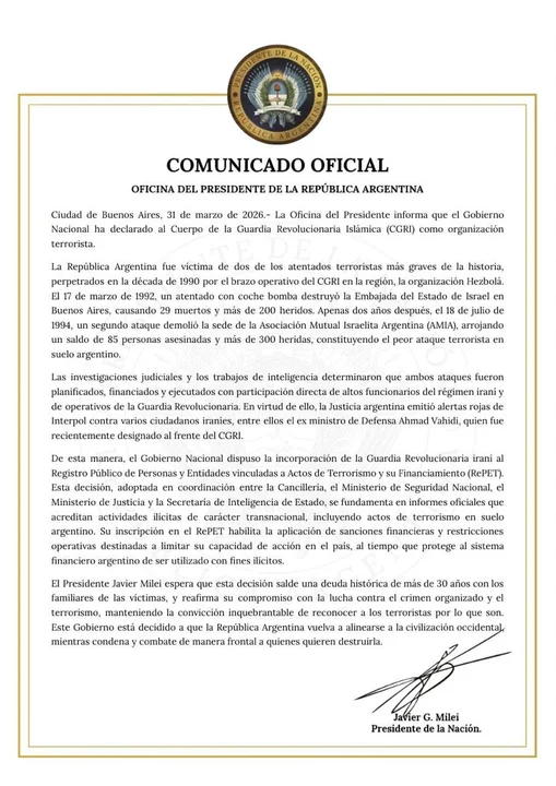 La medida fue informada por la Oficina del Presidente, que señaló que la decisión se fundamenta en investigaciones judiciales y trabajos de inteligencia que vinculan al CGRI con los atentados perpetrados en la década de 1990 en la Argentina.