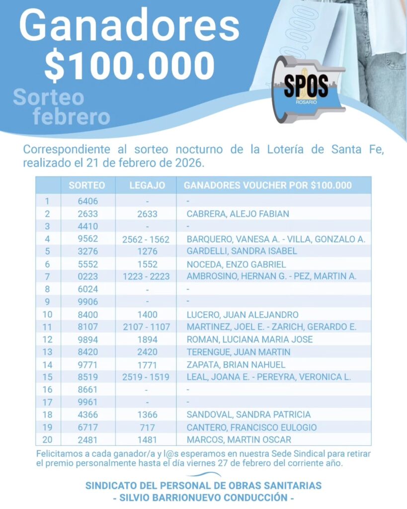 Los ganadores deben retirar personalmente su premio junto con el DNI en la oficina de finanzas de la sede sindical. Hay tiempo hasta el día viernes 17 de Febrero.