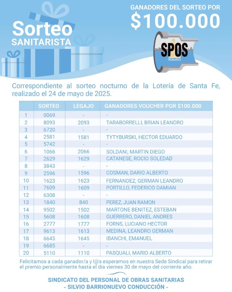 Los ganadores deben retirar personalmente su premio junto con el DNI en la oficina de finanzas de la sede sindical. Hay tiempo hasta el día viernes 30 de mayo.