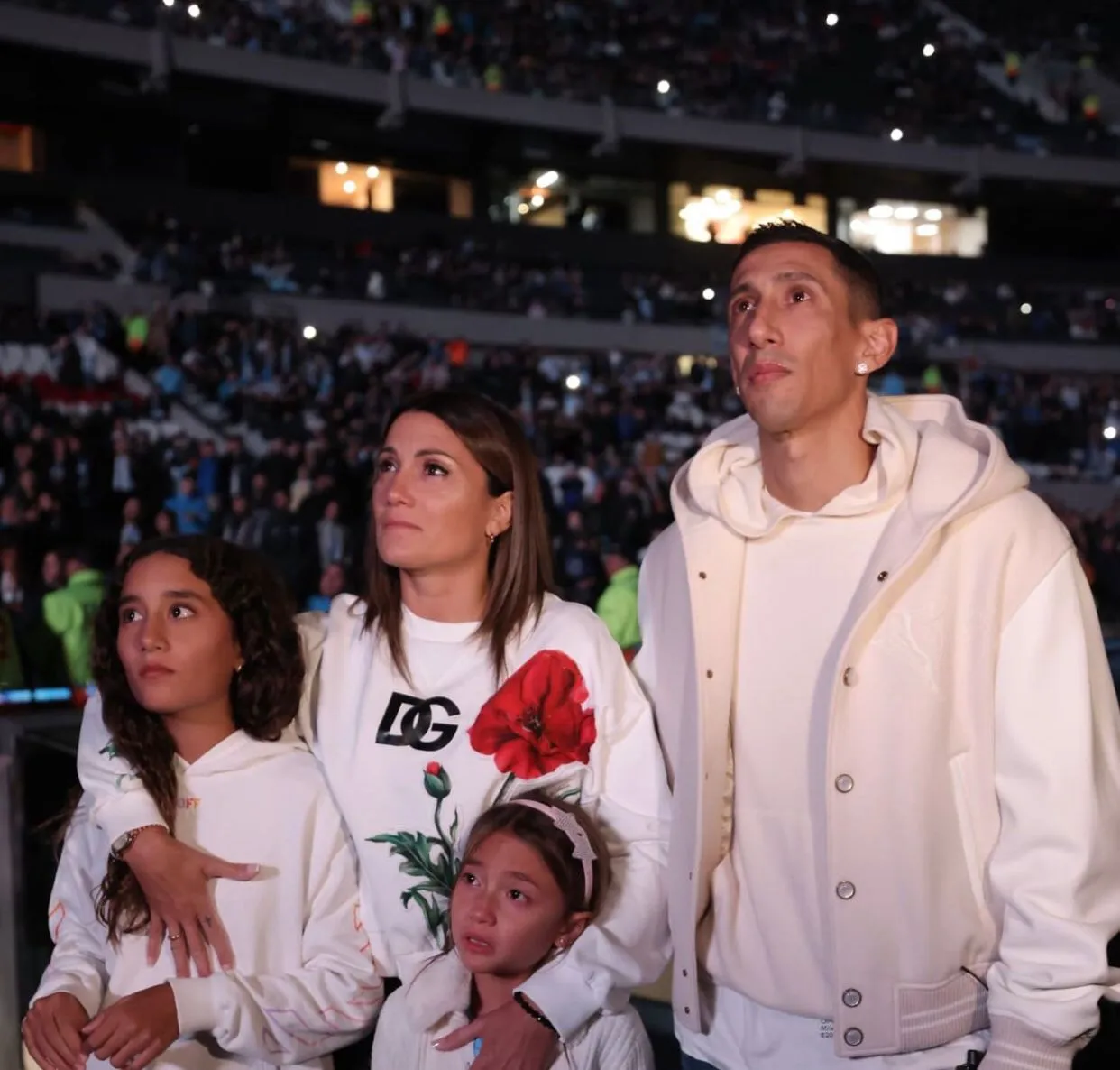El video tuvo la voz de su hija mayor Mía y fue acompañado por un compendio con momentos icónicos de la carrera. “En mi corazón siempre vas a ser el mejor padre y jugador del mundo”, expresó la niña. Ángel no pudo contener la emoción y lloró junto a su mujer Jorgelina Cardozo y sus dos hijas. “Fideo, Fideo, Fideo”, bajó desde las tribunas.