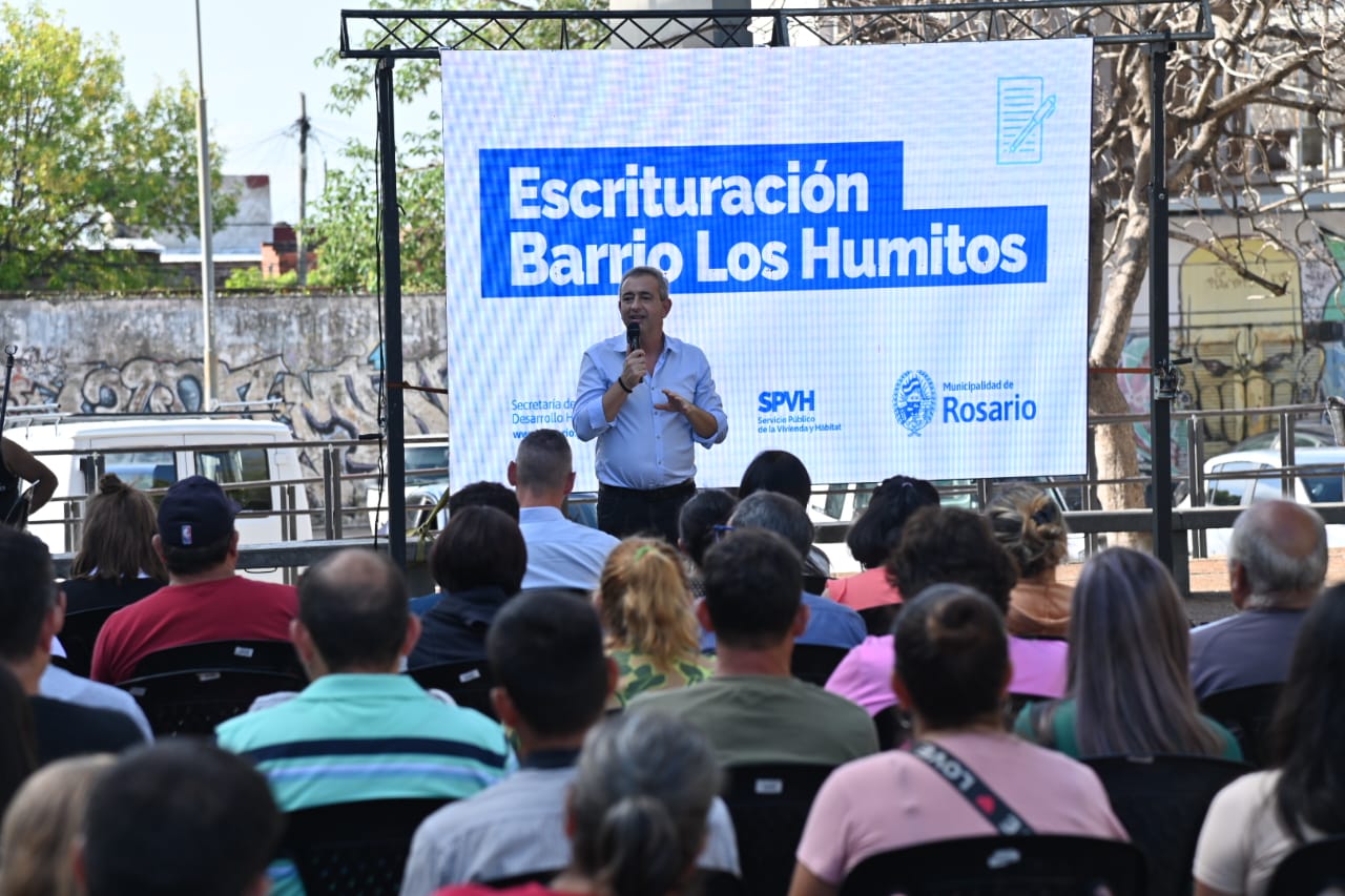El intendente Pablo Javkin encabezó este viernes 28 de marzo la entrega de escrituras a 88 familias que participaron del proceso de regularización dominial del barrio Los Humitos, durante un acto que se desarrolló en el Centro Municipal de Distrito Oeste. Se trata de un plan de urbanización concretado bajo la forma de un fideicomiso social con intervención de los vecinos, el municipio y del Banco Municipal Rosario (BMR) Mandatos y Negocios.