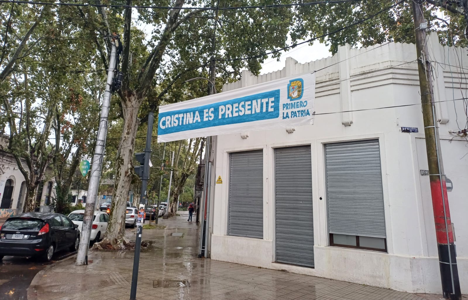 Pasacalles con la frase: Cristina es Presente y acompañado del escudo del peronismo y una firma anónima y general: Primero la Patria