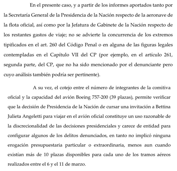 Según surge de la presentación, a partir de informes de la Secretaría General de la Presidencia y de la Jefatura de Gabinete sobre la aeronave y los gastos del viaje, no se verifican los extremos previstos en el artículo 260 del Código Penal ni en otras figuras del Capítulo VII.