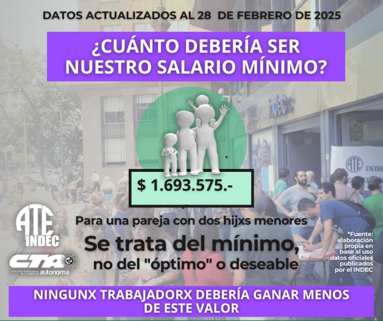 Esta es la información proporcionada por los trabajadores y trabajadoras de INDEC, agrupados en ATE. Durante el mes de febrero de 2025, se necesitó la suma de $1.693.576 para satisfacer las necesidades básicas de un hogar compuesto por una pareja de 35 años con dos hijos en edad escolar. “Nada que festejar ni para el gobierno ni para la clase trabajadora.”, sostienen los trabajadores.