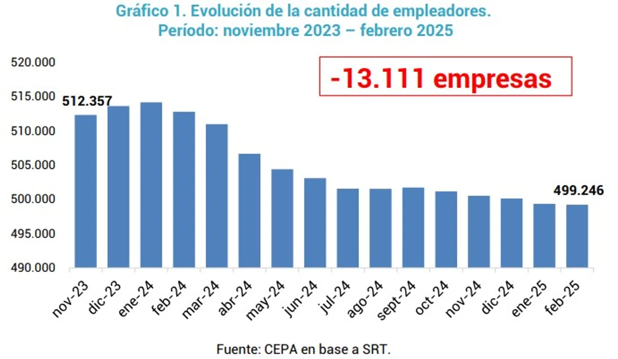 En 15 meses de Gobierno de Javier Milei desaparecieron 13.111 empresas que declaraban trabajadores, casi todas con una plantilla de personal menor a 500, de acuerdo con información publicada por la Superintendencia de Riesgos de Trabajo referida a la Seguridad Social: los 512.317 que recibió al comenzar el mandato se redujeron a 499.246 en febrero último.