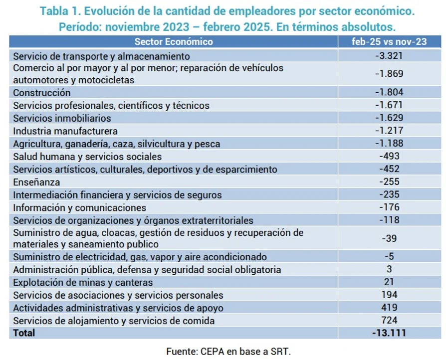 Los datos procesados por el Centro CEPA señalan a “Servicio de transporte y almacenamiento” como el sector más afectado, con una pérdida de 3.321 empleadores en términos absolutos y del 8,4% en el total en relativos.